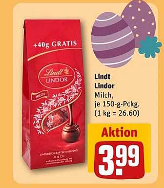 Sehen Sie sich jetzt das Lindt Lindor Milch, je 150-g-Pckg. (+40g GRATIS) Angebot im REWE Center Prospekt an. Dieses Angebot ist gültig von 14.04.2025 bis 20.04.2025.