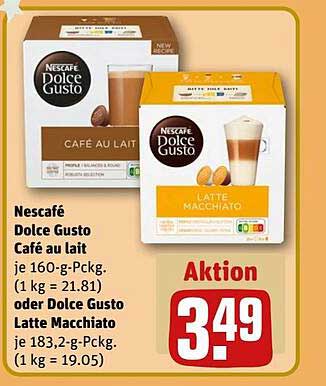 Sehen Sie sich das Nescafé Dolce Gusto Café Au Lait Oder Dolce Gusto Latte Macchiato Angebot bei REWE Center an! Dieses fantastische Angebot ist jetzt im neuesten REWE Center Prospekt verfügbar. Nutzen Sie diese Chance und sparen Sie viel bei Ihrem Einkauf.