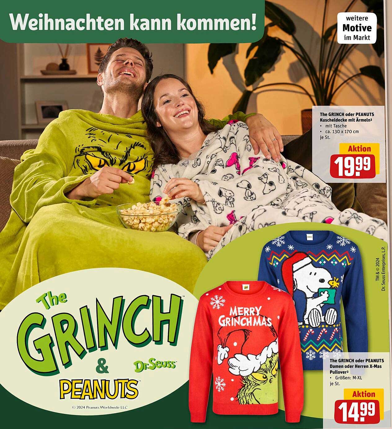 Sehen Sie sich jetzt das The GRINCH oder PEANUTS Kuscheldecke mit Ärmeln The GRINCH oder PEANUTS Damen oder Herren X-Mas Pullover Angebot im REWE Center Prospekt an. Dieses Angebot ist gültig von 11.11.2024 bis 17.11.2024.