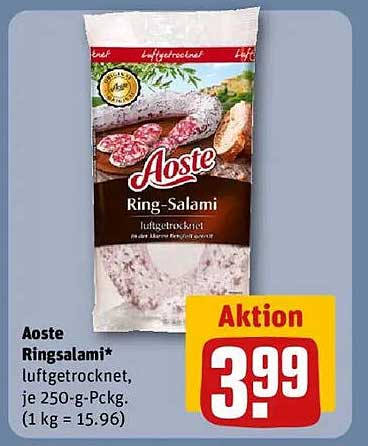 Sehen Sie sich jetzt das Aoste Ring-Salami Angebot im REWE Kaufpark Prospekt an. Dieses Angebot ist gültig von 17.02.2025 bis 23.02.2025.