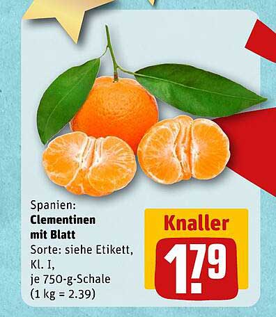 Sehen Sie sich das Clementinen Mit Blatt Angebot bei REWE Kaufpark an! Dieses fantastische Angebot ist jetzt im neuesten REWE Kaufpark Prospekt verfügbar. Nutzen Sie diese Chance und sparen Sie viel bei Ihrem Einkauf.