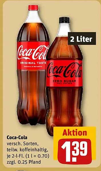 Die beliebte Coca-Cola ist in verschiedenen Sorten erhältlich und bringt den spritzigen Genuss, den viele schätzen. Ob bei einem gemütlichen Abendessen, einer Feier oder einfach zwischendurch – Coca-Cola ist der perfekte Begleiter. Mit dem aktuellen Angebot hier können Sie die 2-Liter-Flasche zum unschlagbaren Preis von nur 1,39 € erwerben!