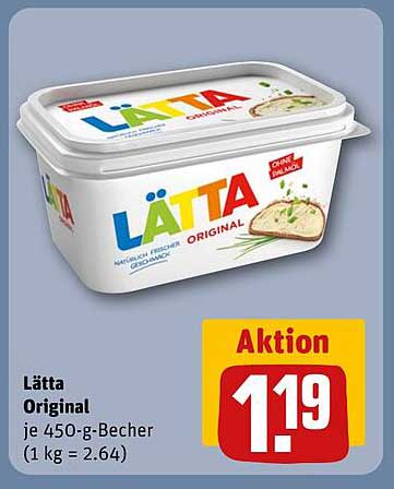 Sehen Sie sich das Lätta Original Angebot bei REWE Kaufpark an! Dieses fantastische Angebot ist jetzt im neuesten REWE Kaufpark Prospekt verfügbar. Nutzen Sie diese Chance und sparen Sie viel bei Ihrem Einkauf.
