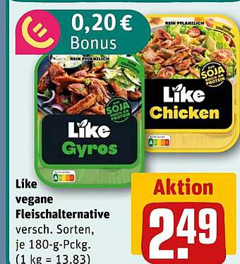 Sehen Sie sich jetzt das Like vegane Fleischalternative – Gyros und Chicken, 180 g Angebot im REWE Kaufpark Prospekt an. Dieses Angebot ist gültig von 22.09.2025 bis 27.09.2025.