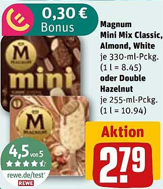 Sehen Sie sich jetzt das Magnum Mini Mix Classic, Almond, White oder Double Hazelnut – Aktion im REWE Kaufpark! Angebot im REWE Kaufpark Prospekt an. Dieses Angebot ist gültig von 15.09.2025 bis 20.09.2025.