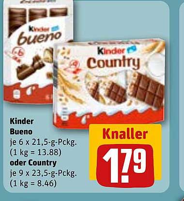 Sehen Sie sich jetzt das Kinder Bueno oder Country Angebot im REWE Prospekt an. Dieses Angebot ist gültig von 18.11.2024 bis 23.11.2024.