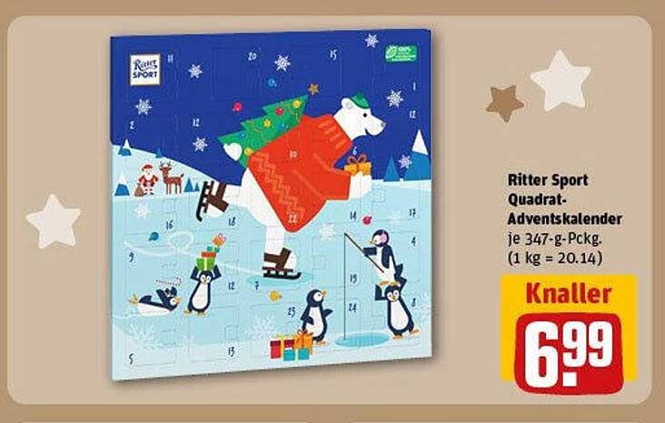 Sehen Sie sich das Ritter Sport Quadrat-Adventskalender Angebot bei REWE an! Dieses fantastische Angebot ist jetzt im neuesten REWE Prospekt verfügbar. Nutzen Sie diese Chance und sparen Sie viel bei Ihrem Einkauf.