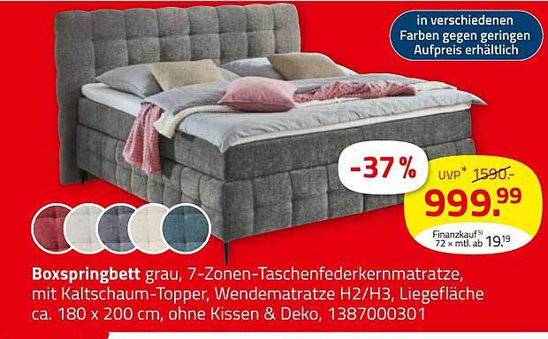 Sehen Sie sich jetzt das Boxspringbett grau, 7-Zonen-Taschenfederkernmatratze, mit Kaltschaum-Topper Angebot im ROLLER Prospekt an. Dieses Angebot ist gültig von 19.10.2025 bis 25.10.2025.