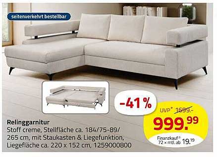 Die Relinggarnitur überzeugt durch ihre vielseitige Nutzung. Ob für entspannte Fernsehabende mit der Familie oder für Übernachtungsgäste – dank der integrierten Liegefunktion sind Sie immer bestens ausgestattet. Der moderne, helle Stoff in Creme schafft eine angenehme Atmosphäre und passt zu jedem Einrichtungsstil. Zudem bietet die Garnitur großzügigen Stauraum im Korpus, ideal für Kissen, Decken oder Bücher.