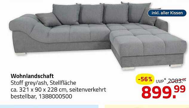 Sehen Sie sich jetzt das Wohnlandschaft Stoff grey/ash, Stellfläche ca. 321 x 90 x 228 cm, seitenverkehrt Angebot im ROLLER Prospekt an. Dieses Angebot ist gültig von 06.07.2025 bis 19.07.2025.