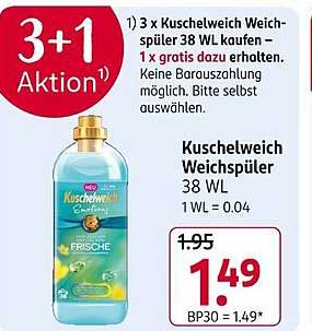 Sehen Sie sich das Kuschelweich Weichspüler 38 Wl Angebot bei Rossmann an! Dieses fantastische Angebot ist jetzt im neuesten Rossmann Prospekt verfügbar. Nutzen Sie diese Chance und sparen Sie viel bei Ihrem Einkauf.