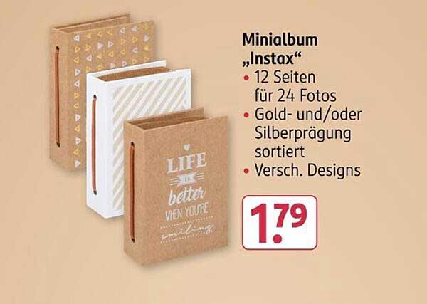 Sehen Sie sich jetzt das Minialbum „Instax“ Angebot im Rossmann Prospekt an. Dieses Angebot ist gültig von 07.04.2025 bis 11.04.2025.