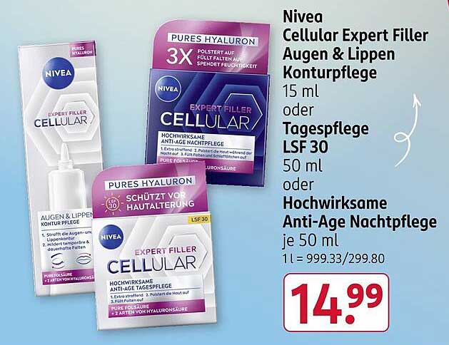 Sehen Sie sich jetzt das Nivea Cellular Expert Filler Augen & Lippen Konturpflege 15 ml oder Tagespflege LSF 30 50 ml oder Hochwirksame Anti-Age Nachtpflege je 50 ml Angebot im Rossmann Prospekt an. Dieses Angebot ist gültig von 13.10.2025 bis 17.10.2025.
