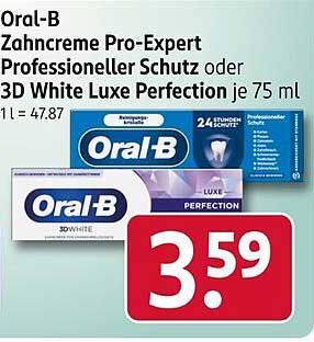 Sehen Sie sich jetzt das Oral-B Zahnpasta Pro-Expert oder 3D White Luxe Perfection 75 ml Angebot im Rossmann Prospekt an. Dieses Angebot ist gültig von 13.10.2025 bis 17.10.2025.