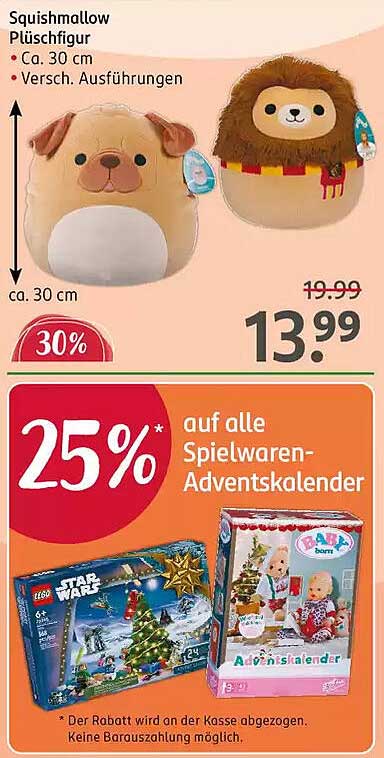 Sehen Sie sich das Squishmallow Plüschfigur Angebot bei Rossmann an! Dieses fantastische Angebot ist jetzt im neuesten Rossmann Prospekt verfügbar. Nutzen Sie diese Chance und sparen Sie viel bei Ihrem Einkauf.