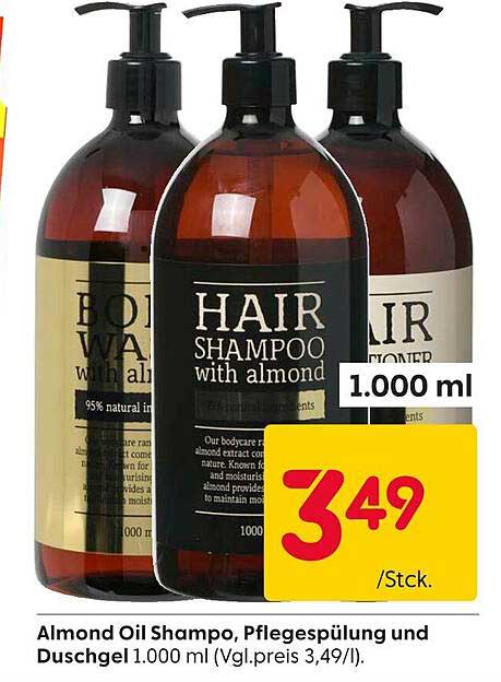 Sehen Sie sich jetzt das Almond Oil Shampoo, Pflegespülung und Duschgel 1.000 ml Angebot im Rusta Prospekt an. Dieses Angebot ist gültig von 20.09.2025 bis 26.09.2025.