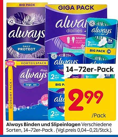Das preiswerte Angebot für Always Binden und Slips Einlagen überzeugt durch seine große Auswahl an verschiedenen Sorten und Packungsgrößen. Gültig vom 04.10.2025 bis zum 10.10.2025, bietet dieser Aktionspreis von nur 2,99 € pro Packung eine hervorragende Möglichkeit, hochwertige Hygieneprodukte zu einem unschlagbaren Preis zu erwerben.