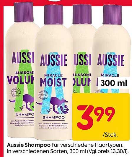 Sehen Sie sich jetzt das Aussie Shampoo – Für verschiedene Haartypen, 300 ml Angebot im Rusta Prospekt an. Dieses Angebot ist gültig von 04.10.2025 bis 10.10.2025.