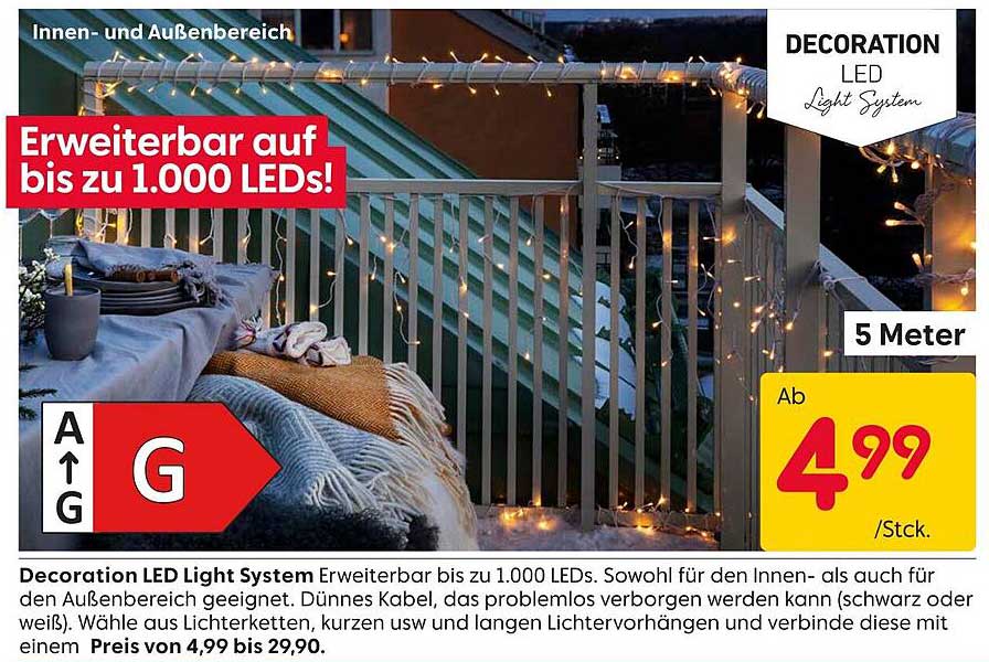 Beleuchtung spielt eine zentrale Rolle in jedem Zuhause, wobei sie Atmosphäre und Stil schafft. Das Decoration LED Light System ist eine ideale Lösung, um sowohl Innen- als auch Außenbereiche zu gestalten. Mit der Option, bis zu 1.000 LEDs zu integrieren, bietet dieses System grenzenlose kreative Möglichkeiten. Nutzen Sie die Kraft der LED-Beleuchtung für Ihren Balkon, Garten oder das Wohnzimmer und verwandeln Sie Ihre Umgebung in ein gemütliches Lichtermeer.