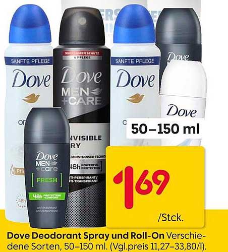 Sehen Sie sich jetzt das Dove Deodorant Spray und Roll-On Verschiedene Sorten, 50–150 ml Angebot im Rusta Prospekt an. Dieses Angebot ist gültig von 31.05.2025 bis 06.06.2025.