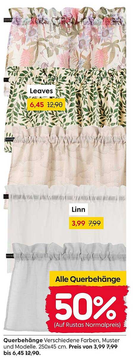 Der Preis für die Querbehänge beginnt bereits bei 3,99 Euro, was im Vergleich zu den regulären Preisen von bis zu 12,90 Euro einen beeindruckenden Rabatt von 50 % bedeutet! Nutzen Sie diese Gelegenheit, um Ihre Fenster kostengünstig zu dekorieren und gleichzeitig Geld zu sparen.