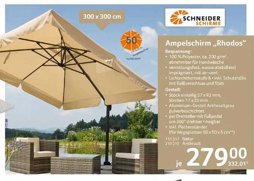 Der reguläre Preis für den Ampelschirm „Rhodos“ beträgt 332,01 EUR, doch auf dieser Seite erhalten Sie ihn für lediglich 279,00 EUR. Das bedeutet eine Ersparnis von über 50 Euro! Solch ein attraktives Preis-Leistungs-Verhältnis sollten Sie sich nicht entgehen lassen, insbesondere wenn Sie planen, Ihre Outdoor-Bereiche stilvoll und komfortabel zu gestalten.