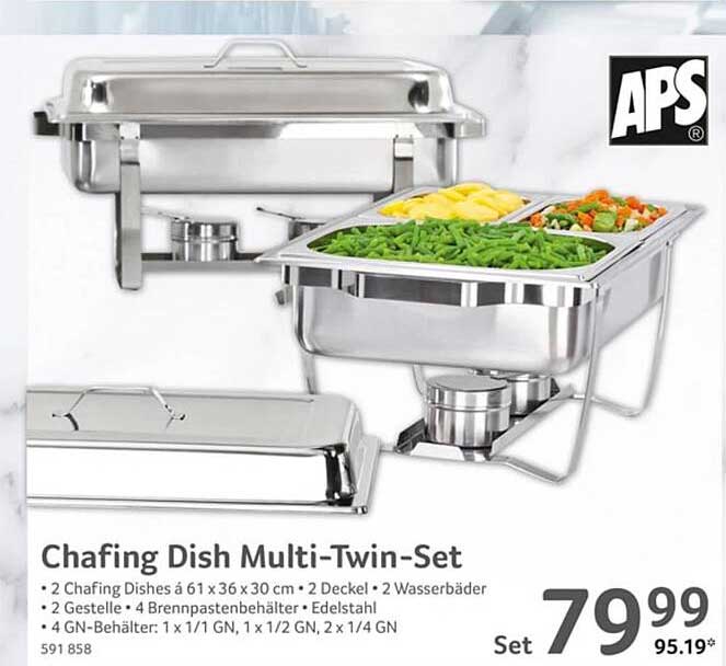 Der reguläre Preis für dieses Chafing Dish Multi-Twin-Set beträgt 79,99 €. Aktuell erhalten Sie es zum Sonderpreis von nur 59,99 €. Das bedeutet eine Ersparnis von 20 €, was dieses Angebot besonders attraktiv macht. Nutzen Sie die Gelegenheit, um Ihre Feste noch unvergesslicher zu gestalten!