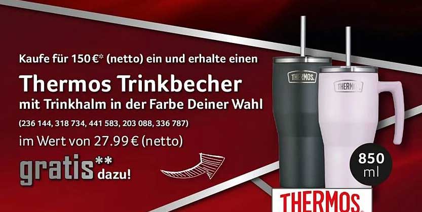 Auf dieser Seite haben wir ein besonders attraktives Angebot für dich: Kaufe für 150€ (netto) ein und erhalte einen hochwertigem Thermos Trinkbecher im Wert von 27,99€ (netto) gratis dazu! Dieser großzügige Deal ist nicht nur eine hervorragende Gelegenheit, dir etwas Gutes zu tun, sondern auch um deine Getränke stilvoll und länger frisch zu halten.