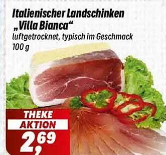 Freunde des feinen Geschmacks aufgepasst! Der italienische Landschinken "Villa Bianca" ist nicht nur eine kulinarische Versuchung, sondern auch ein unschlagbares Angebot. Genießen Sie 100 g dieses köstlichen Schinkens für nur 2,69 €. Ein Muss für jede Brotzeit oder Antipasti-Platte!