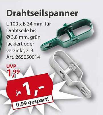 Sehen Sie sich jetzt das Drahtseilspanner L 100 x B 34 mm, für Drahtseile bis Ø 3,8 mm Angebot im Sonderpreis Baumarkt Prospekt an. Dieses Angebot ist gültig von 27.09.2025 bis 03.10.2025.