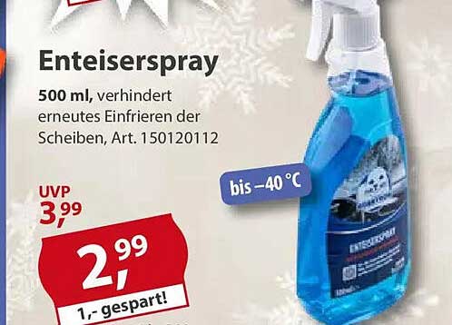 Sehen Sie sich jetzt das Enteiserspray 500 ml - verhindert erneutes Einfrieren der Scheiben Angebot im Sonderpreis Baumarkt Prospekt an. Dieses Angebot ist gültig von 01.11.2025 bis 07.11.2025.