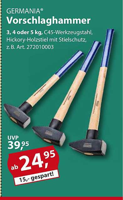 Sehen Sie sich jetzt das GERMANIA® Vorschlaghammer 3, 4 oder 5 kg, C45-Werkzeugstahl Angebot im Sonderpreis Baumarkt Prospekt an. Dieses Angebot ist gültig von 17.05.2025 bis 23.05.2025.