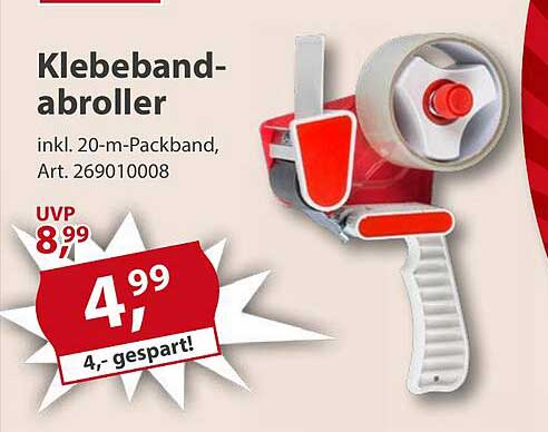 Der ursprüngliche Preis für den Klebebandabroller betrug 8,99 €. Aktuell erhalten Sie ihn jedoch für nur 4,99 €. Damit sparen Sie 4,00 €! Diese Ersparnis macht das Angebot besonders attraktiv, da Sie nicht nur ein hochwertiges Produkt erwerben, sondern auch Ihr Budget schonen.