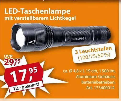 Aktuell erhalten Sie diese hochwertige LED-Taschenlampe zum Preis von nur 17,95 €, was bedeutet, dass Sie 12 € sparen können! Der reguläre Preis liegt bei 29,95 €, sodass sich dieses Angebot definitiv lohnt. Nutzen Sie die Gelegenheit, um sich ein Qualitätserzeugnis zu einem unschlagbaren Preis zu sichern.