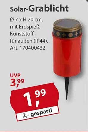 Sehen Sie sich jetzt das Solar-Grabllicht Ø 7 x H 20 cm mit Erdstift, Kunststoff, für außen (IP44) Angebot im Sonderpreis Baumarkt Prospekt an. Dieses Angebot ist gültig von 05.04.2025 bis 11.04.2025.