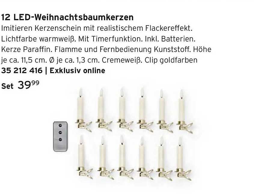 Jetzt können Sie dieses Set von 12 LED-Weihnachtsbaumkerzen für nur 39,99 € erwerben. Der ursprüngliche Preis liegt in der Regel deutlich höher, was dieses Angebot besonders attraktiv macht. Nutzen Sie die Gelegenheit und bringen Sie festliche Stimmung in Ihr Zuhause!