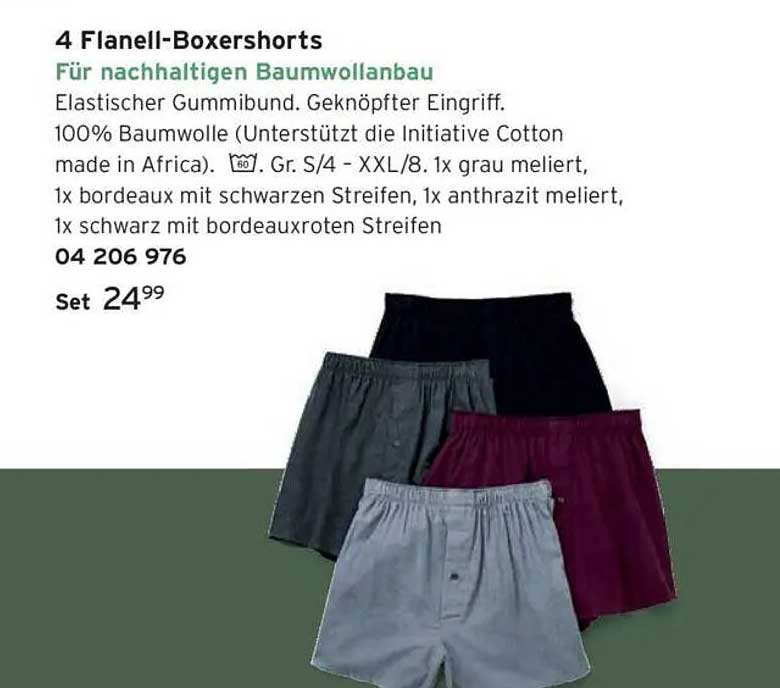 Die 4 Flanell-Boxershorts von Tchibo vereinen Style und Nachhaltigkeit. Hergestellt aus 100% Baumwolle unterstützen sie die Initiative Cotton made in Africa. Dieses Set ist ideal für alle, die sowohl umweltbewusst leben als auch Wert auf Komfort und modisches Design legen.