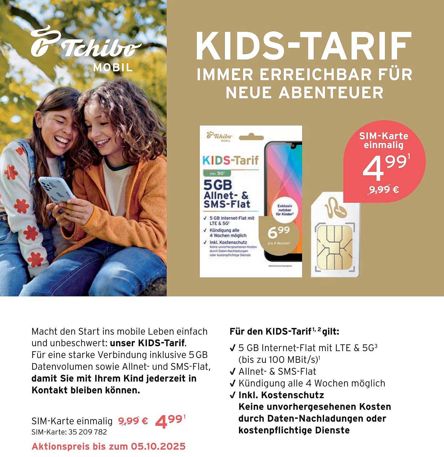 Sehen Sie sich jetzt das KIDS-Tarif - 5 GB Allnet- und SMS-Flatrate Angebot im Tchibo Prospekt an. Dieses Angebot ist gültig von 28.09.2025 bis 05.10.2025.
