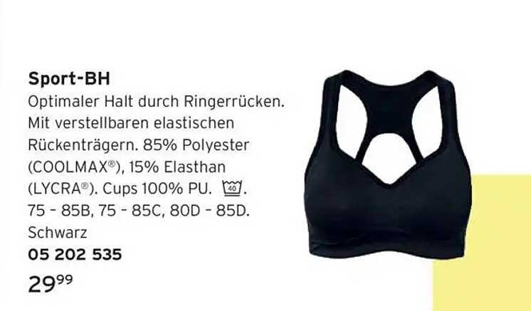 Der neue Sport-BH von Tchibo bietet optimalen Halt und Unterstützung während des Trainings. Mit seinem modernen Ringerrücken-Design sorgt er nicht nur für eine gute Passform, sondern sieht auch noch stylisch aus. Die verstellbaren elastischen Rückensträger ermöglichen eine individuelle Anpassung, damit du dich beim Sport voll und ganz auf dein Training konzentrieren kannst.