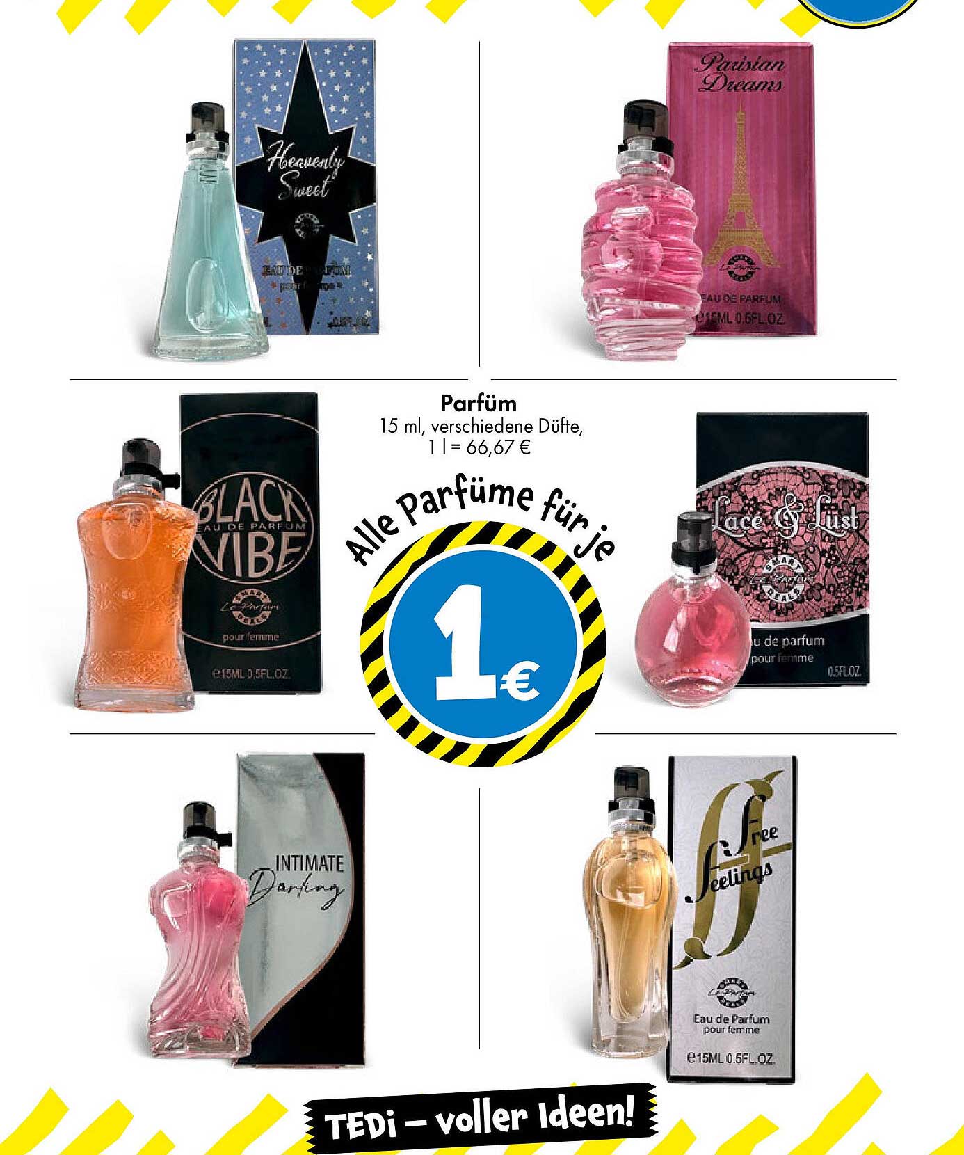 Sehen Sie sich jetzt das Alle Parfums für je 1 € Angebot im TEDi Prospekt an. Dieses Angebot ist gültig von 29.09.2025 bis 06.10.2025.