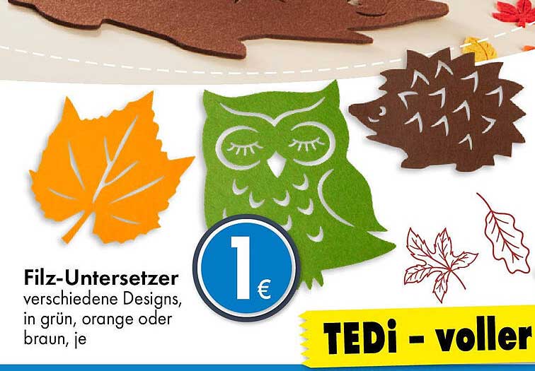 Sehen Sie sich das Filz-Untersetzer Angebot bei TEDi an! Dieses fantastische Angebot ist jetzt im neuesten TEDi Prospekt verfügbar. Nutzen Sie diese Chance und sparen Sie viel bei Ihrem Einkauf.