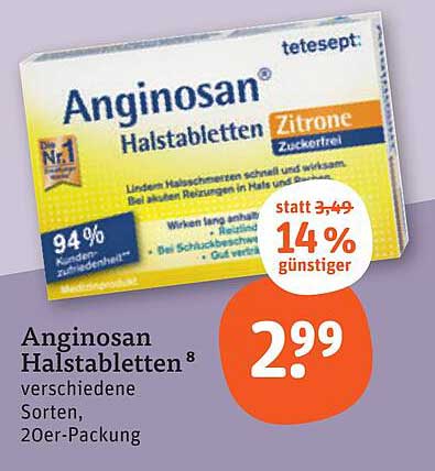 Aktuell erhalten Sie die Anginosan Halstabletten zu einem sensationellen Preis von nur 2,99 Euro. Im Vergleich zum regulären Preis von 3,49 Euro sparen Sie somit 14%. Ein hervorragendes Angebot, das nicht nur Ihren Geldbeutel schont, sondern auch Ihrer Gesundheit zugutekommt.