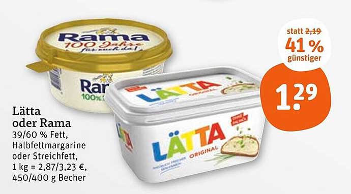 Sehen Sie sich jetzt das Lätta oder Rama HalbFettmargarine oder Streichfett 450 g Angebot im tegut Prospekt an. Dieses Angebot ist gültig von 13.10.2025 bis 18.10.2025.