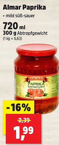 Aktuell erhalten Sie Almar Paprika zum Preis von nur 1,99 €. Im Vergleich zum regulären Preis von 2,39 € sparen Sie damit 16%! Nutzen Sie diese Gelegenheit, um Ihre Küche mit einem schmackhaften und vielseitigen Produkt zu bereichern, das nicht nur gut schmeckt, sondern auch Ihr Budget schont.