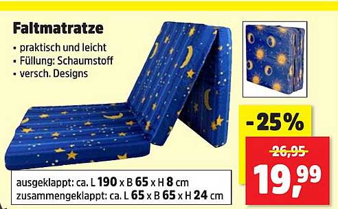 Der aktuelle Preis von 19,99 € ist ein echter Schnäppchenpreis im Vergleich zum regulären Preis von 26,95 €. Das bedeutet eine Ersparnis von stolzen 25%! Nutze diese Gelegenheit, um dir die Faltmatratze zum reduzierten Preis zu sichern und mehr Komfort in deinem Zuhause zu schaffen.