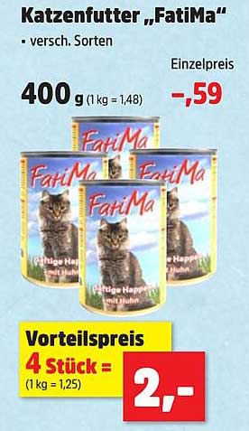 Sehen Sie sich jetzt das Katzenfutter 'FatiMa' - 400 g Angebot im Thomas Philipps Prospekt an. Dieses Angebot ist gültig von 07.04.2025 bis 12.04.2025.