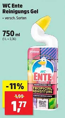 Der reguläre Preis für das WC Ente Reinigungs Gel beträgt 1,99 Euro, was einem Preis von 2,36 Euro pro Liter entspricht. Aktuell bekommst du es jedoch für nur 1,77 Euro. Das bedeutet eine Ersparnis von 11%, die du dir nicht entgehen lassen solltest! Nutze die Gelegenheit, um deinem Bad eine gründliche Reinigung zu gönnen und dabei noch Geld zu sparen.