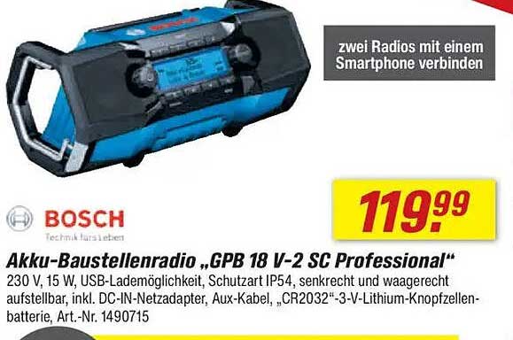 Das Akku-Baustellenradio „GPB 18 V-2 SC Professional“ von Bosch ist der ideale Begleiter für Ihre Baustelle oder für den Garten. Mit leistungsstarkem Sound und der Möglichkeit, Ihr Smartphone zu verbinden, sorgt dieses Radio dafür, dass Sie auch bei der Arbeit Ihre Lieblingsmusik genießen können. Dank der robusten Bauweise und des Spritzwasserschutzes ist es perfekt für den Einsatz im Freien geeignet.