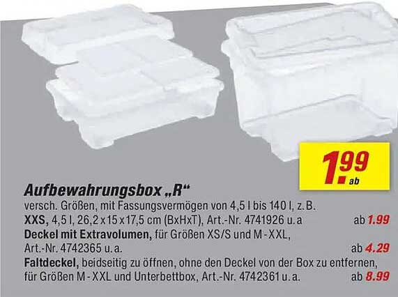 Sehen Sie sich jetzt das Aufbewahrungsbox „R“ - vielseitig und praktisch Angebot im toom Baumarkt Prospekt an. Dieses Angebot ist gültig von 31.03.2025 bis 04.04.2025.