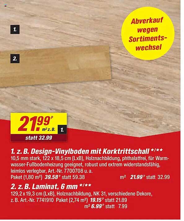 Der aktuelle Preis für den Design-Vinylboden liegt bei nur 21,99 € pro Quadratmeter, was eine erhebliche Ersparnis im Vergleich zum regulären Preis von 32,99 € darstellt. Auch das Laminat reduziert sich auf 6,99 € pro Quadratmeter – ein unschlagbares Angebot! Nutzen Sie diese Gelegenheit, um schnell und günstig die Gestaltung Ihrer Räume zu verändern.